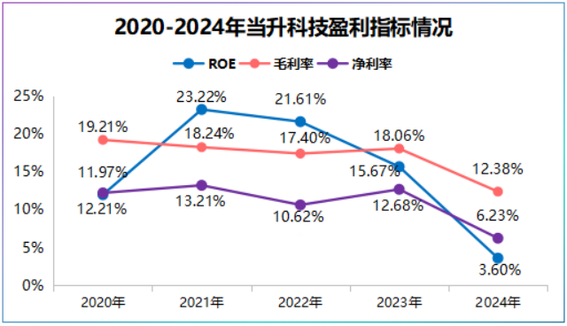 然而,到了2024年,当升科技ROE降至3.6%,同比下滑了12个百分点,毛利率同比下滑5.68个百分点,净利率同比下滑6.45个百分点,盈利能力减弱。