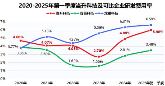 2023年以来,当升科技研发费用率快速提升,从2.7%提高到了2025年第一季度的5.98%,不仅高于容百科技,也不断缩小与龙蟠科技的差距。