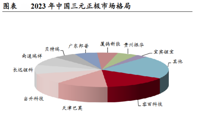 从出货量上看,2023我国三元正极材料市占率前三分别为容百科技、天津巴莫和当升科技,合计约占50%的市场份额。