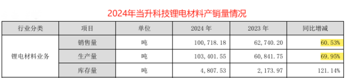 2024年,当升科技锂电材料销售量高达10.07万吨,同比大幅增长60.53%,与生产量基本保持同速增长,产能利用率为80.16%,同比提高了近7个百分点。